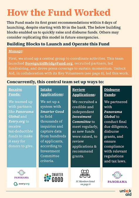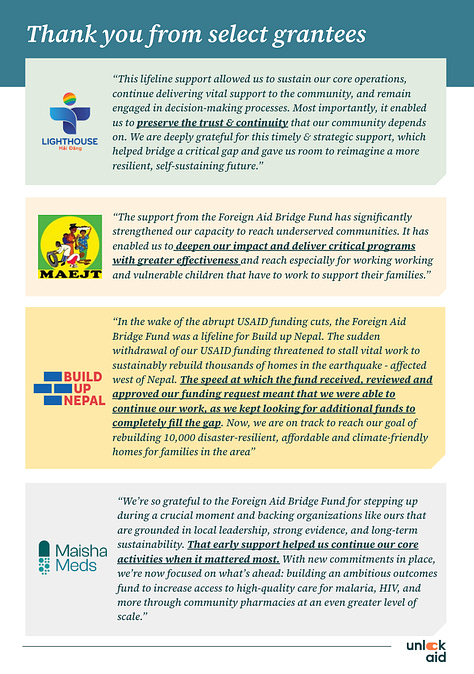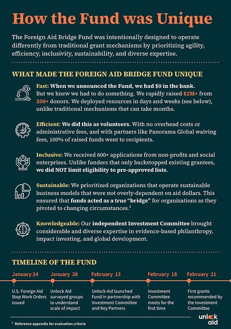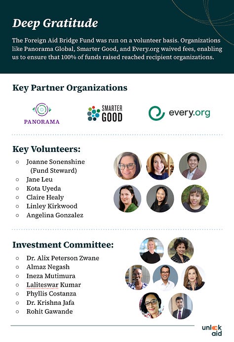 At Unlock Aid, we often talk about "the doers,” the people and organizations on the front lines who don't wait for perfect conditions. Instead, they move. They adapt. They know that in crisis, action matters more than perfection. The Foreign Aid Bridge Fund was created in that spirit, with extraordinary partners like Panorama Global, Every.org, Smarter Good, and an Investment Committee that made it possible.