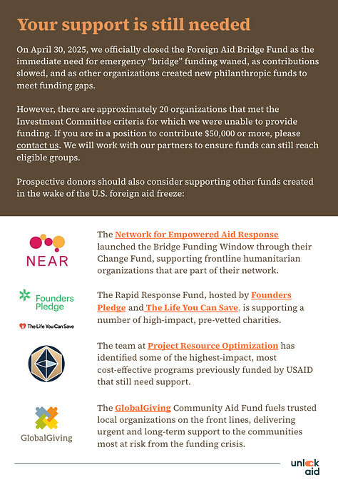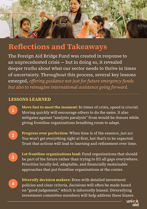 The Foreign Aid Bridge Fund was always meant to be a bridge, not a permanent solution. But it showed what's possible when we put trust in the people doing the work, cut out bureaucracy, and act in alignment with our values.