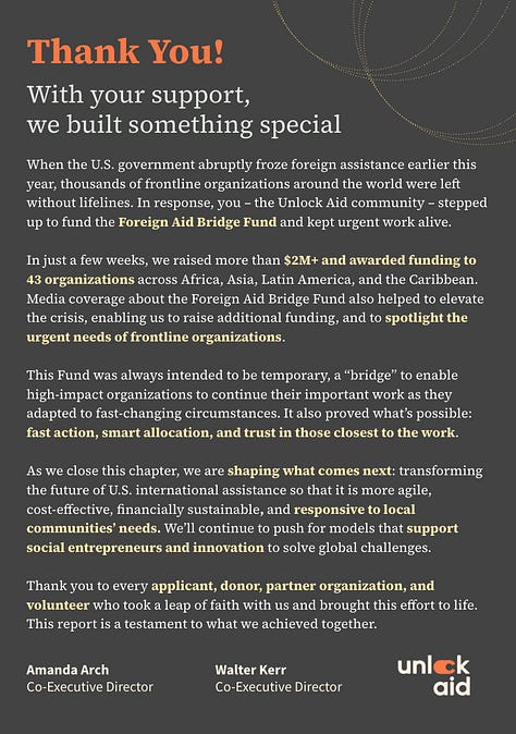 Huge kudos to the Unlock Aid team and partners for showing what’s possible when trust, speed, and solidarity come first. Thank you for putting this out into the world, and for sharing the playbook so others can follow.