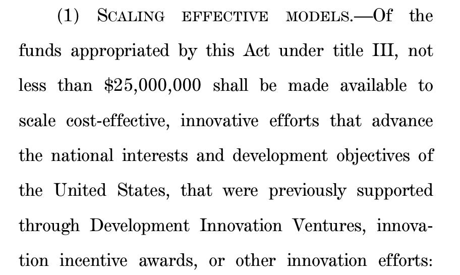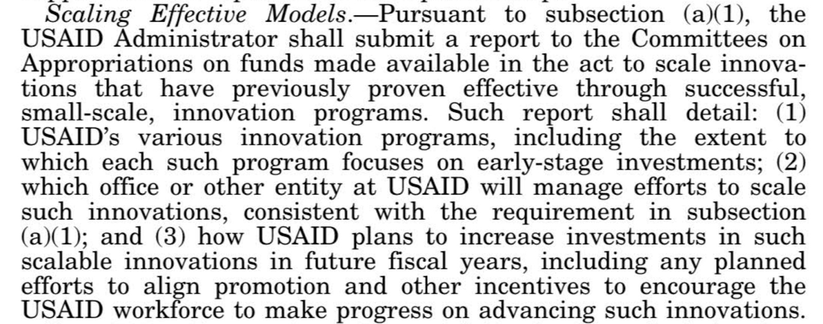 Further, lawmakers also want to make sure scale-up funding isn’t limited to this pot of funding alone – and that agencies like USAID must find ways to promote and incentivize staff who make scaling funding for proven innovations a priority.
